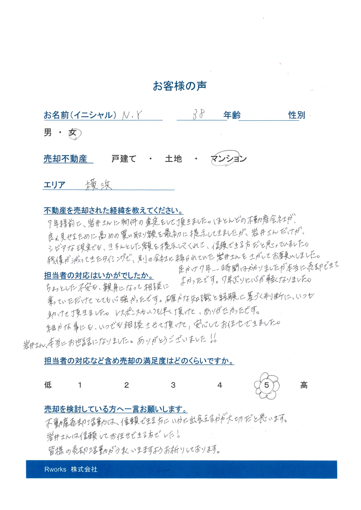 | Q.不動産のご購入を検討している方へ一言お願いします。 | 不動産売却活動は、信頼できる方にいかに出会えるかが大切だと思います。 岩井さんは信頼してお任せできる方でした! 皆様の売却活動がうまくいきますようお祈りしております。 |