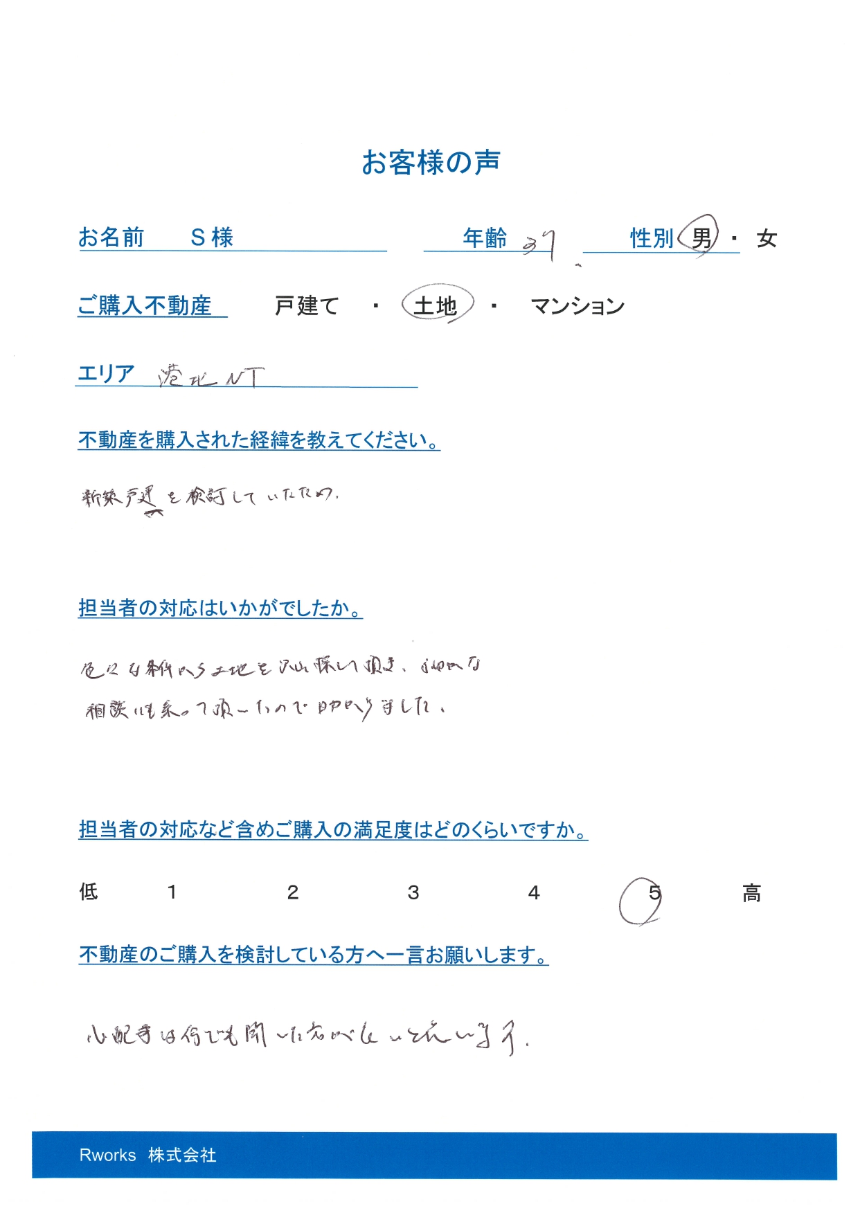色々な条件から土地を沢山探して頂き、細かな相談にも乗って頂いたので助かりました。